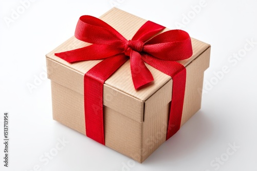 Gift Box with Red Ribbon - A square gift box, light brown in color, adorned with a vibrant red ribbon tied in a bow. Perfect for holidays or special occasions