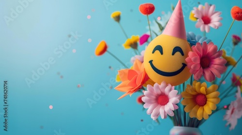 Gift smiley bouquet design. Happy to you greeting text in empty space with smiley emoji in party hat bouquet for anniversary. Generative AI
