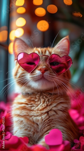 Ginger Cat with Heart-Shaped Glasses and Festive Bokeh Lights