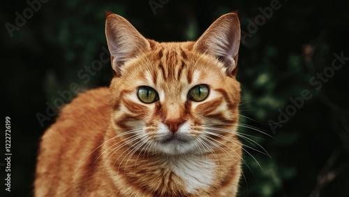 Ginger cat with striking green eyes in sharp focus, exhibiting vibrant orange fur against a dark green blurred background.