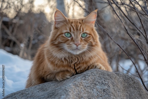 Ginger Norwegian Forest Cat in snowy forest closeup shot