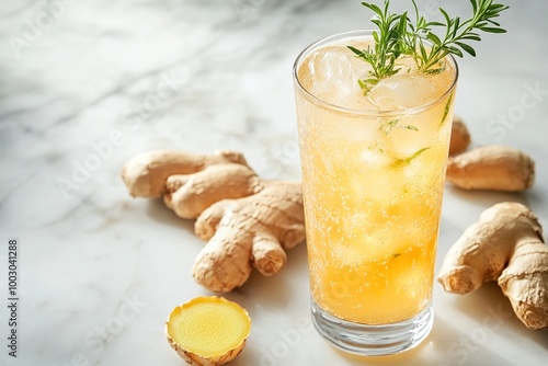 ginger soda with ice and a sprig of rosemary served in a tall glass on a marble surface