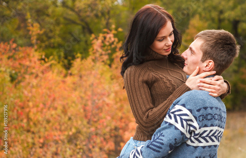 girl at the hands of Man. A loving couple walking in the autumn park.