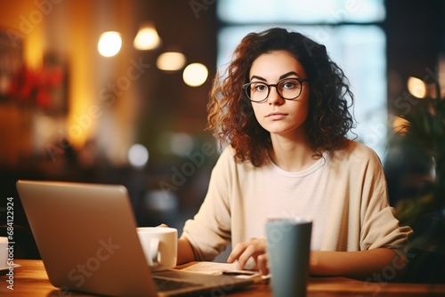 Girl freelancer or student using her computer in a cafe, making eye contact with the camera. Bright solid background.