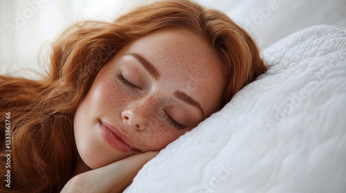 girl in peaceful slumber on white bed, her red hair cascading softly. serene expression and freckles add to tranquil atmosphere of moment
