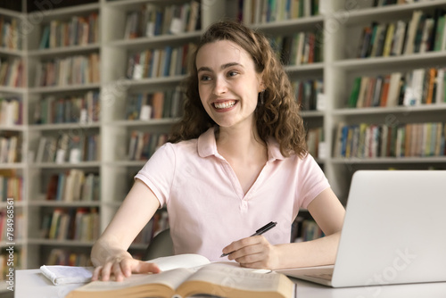 Girl learner holding pen, make exercise seated at desk with textbook and laptop, looking aside. Higher education, professional skills use internet resources, excellent student portrait, intelligence