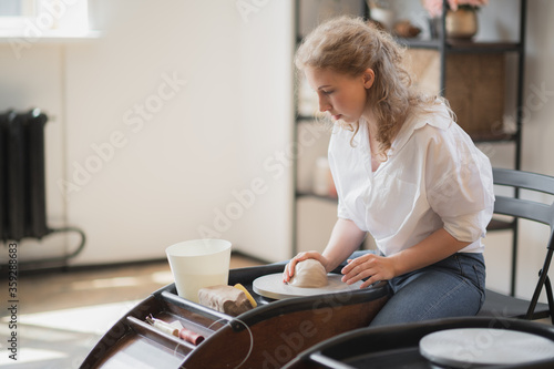 Girl makes pottery from clay. She making ceramic products from white clay using twisted potter's wheel.