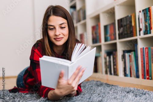 Girl reading a book. Woman lying on the floor reads book.