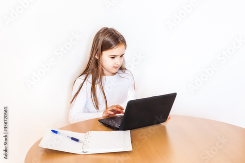 Girl, school girl doing homework at home at the table on a laptop, computer, notes, notebook, school, learning at home