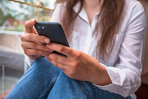 girl sitting at the window and holding a smartphone and watching social network close up hands and smartphone. Online shopping.