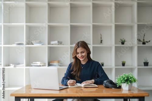 girl using laptop at home looking at write or take notes in a notebook. Young woman having virtual meeting online chat video call conference. Work learning from home