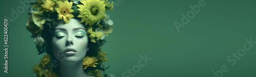girl wearing a wreath of green wildflowers, Green background, copy space, generative ai