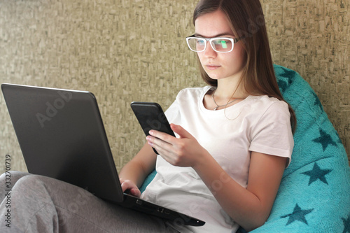 Girl with a phone and a computer. Freelance. Beautiful girl sitting on internet using smartphone. Girl works at home
