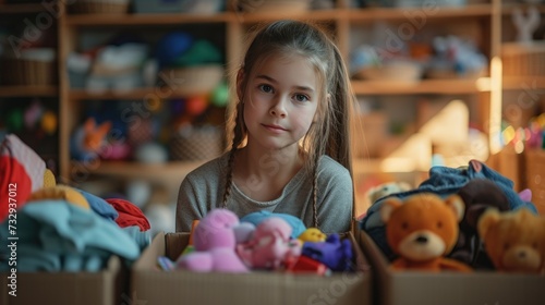 Girl with Donated Toys and Clothes, young girl smiles gently as she sorts through a box of toys and clothes, symbolizing childhood, generosity, and the simple joy of giving