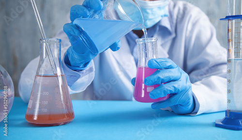 Girl working with flask in a laboratory.