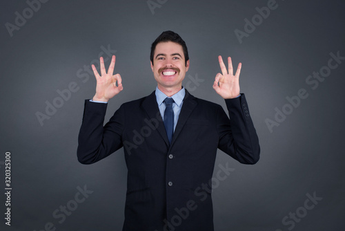 Glad attractive man shows ok sign with both hands as expresses approval, has cheerful expression. Photo of beautiful female has appealing appearance, being optimistic. Standing against gray wall.