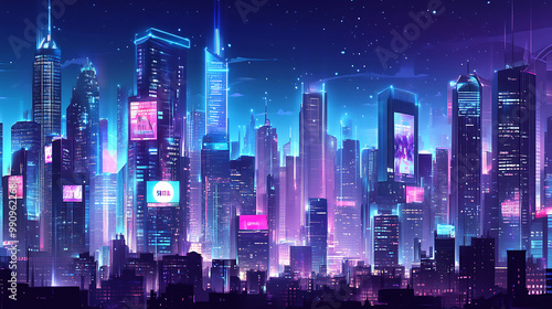 Glamorous background with an AI-designed futuristic cityscape, featuring towering skyscrapers, digital billboards, and a neon-lit skyline