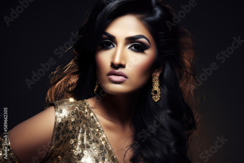 Glamorous Bollywood actress in a sequined dress with bold makeup and confident expression, generative ai