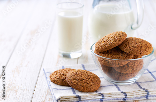 Glass and a jug of fresh milk with oatmeal cookies on a on a white table,selective focus.