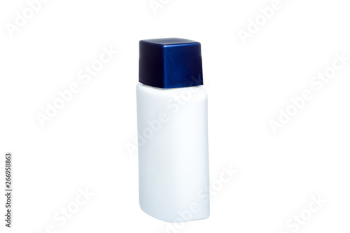 glass bottle no label white colore with blue plastic cap isolated on white background side view.