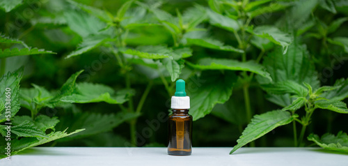 Glass bottle of stinging nettle on blurred background of green nettle bushes.