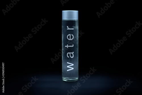 Glass bottle wet with cold water. External surface with drops of condensation water with the inscription "water". Black background.