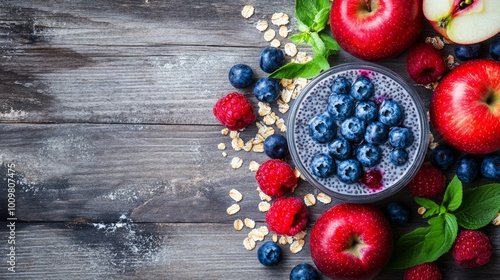 Glass chia pudding with red apple, blueberries, and oat flakes against a wooden backdrop. top view. concept of healthy eating.