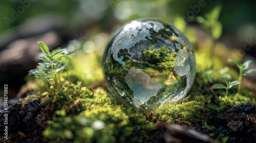 Glass globe representing Earth nestled in green moss and new plant shoots. World Environment Day concept.