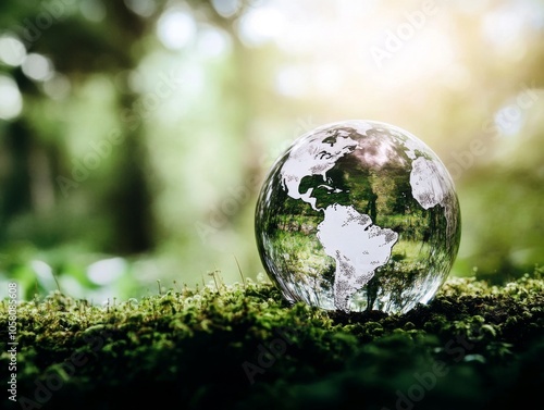 Glass globe resting on mossy ground in a forest, surrounded by a blurred green background, symbolizing an eco-friendly concept and commitment to environmental protection.