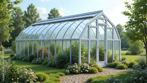Glass greenhouse with arched roof surrounded by plants and tall grass