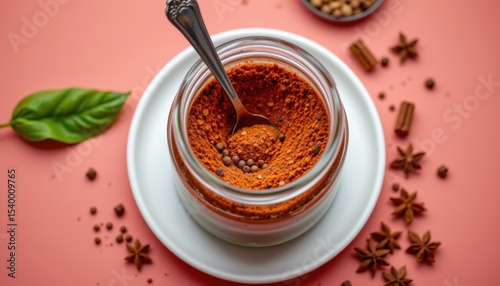 Glass Jar Filled with Rich Cinnamon and Spices with a Silver Spoon on a Coral Background