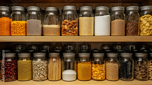 Glass Jars Filled with Colorful Spices and Ingredients Organized on a Wooden Shelf