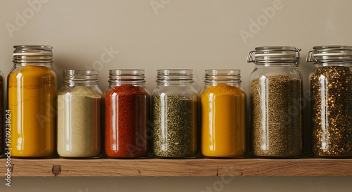 Glass Jars Filled with Colorful Spices on Rustic Wooden Shelf