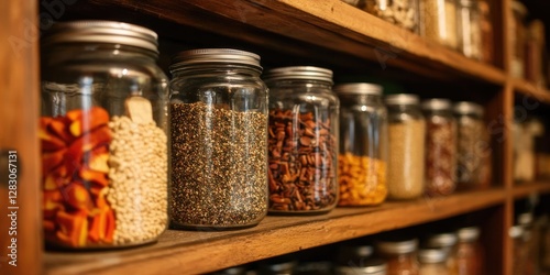 Glass jars filled with various grains and seeds arranged on wooden shelves in a warm, rustic kitchen environment with earthy tones.