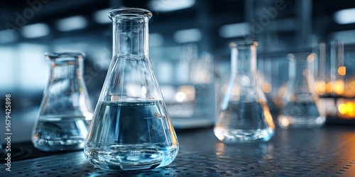 Glass Laboratory Equipment with Clear Liquids in a Modern Science Laboratory Setting