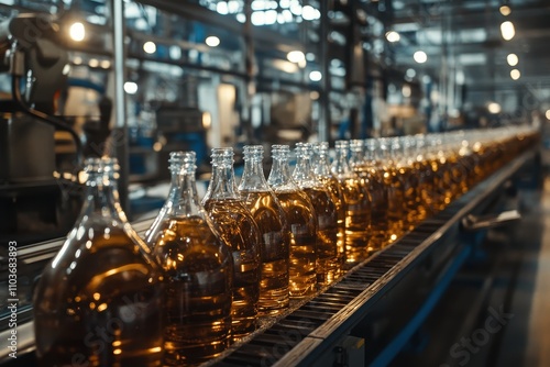 Glass manufacturing facility producing containers using modern robotic technology Includes party drink bottles Industrial environment with available space for text