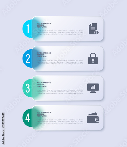 Glass morphism vertical infographic design template. Four steps or process vector infographic layout
