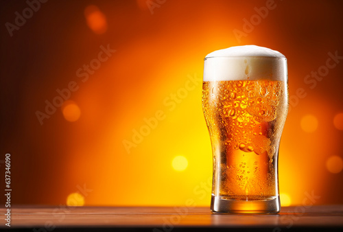 Glass of beer on wooden table. Blurred background with space for text, copyspace, banner.
