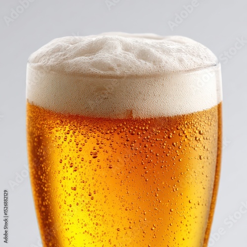 Glass of beer sits with thick head and bubbles. Refreshment, beverage, alcohol, drink, cold