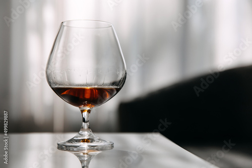 Glass of brandy on a table in daylight.