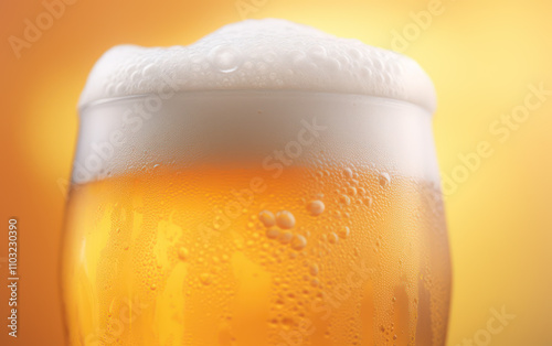 Glass of Cold Beer with Foamy Head Against a Bright Yellow Background Ideal for Beverage Promotion and Summer Celebrations