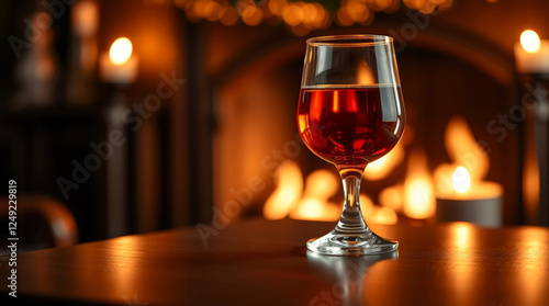 Glass of Dessert Wine by a Cozy Fireplace with Warm Candlelight and Soft Reflections