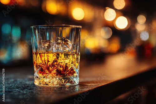 Glass of elegant whiskey with ice cubes on a bar counter with dark moody atmosphere. Drink art concept