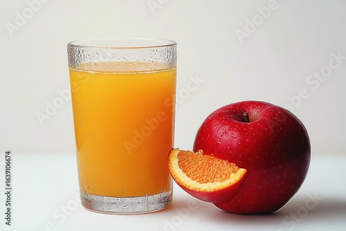 Glass of fresh orange juice next to a red apple with an orange wedge on a white surface