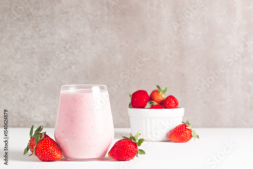 Glass of fresh strawberry milkshake, smoothie and fresh strawberries on white and wooden background. Healthy food and drink concept.