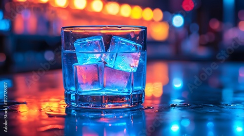 Glass of ice water on bar counter with neon lights.