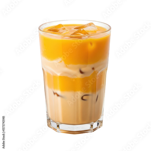Glass of layered iced drink with milk and orange liquid isolated on transparent background