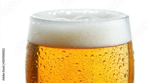Glass of light beer with thick, frothy foam head, condensation droplets visible, isolated on white background