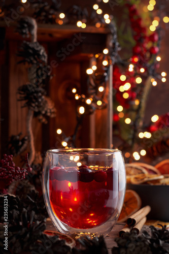 Glass of mulled wine with cranberry. Christmas or New Year drink
