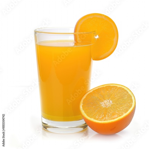 Glass of orange juice on white background. Fresh, ripe, and juicy orange liquid in glassware. Bright, warm, and appetising colours of healthy beverage.